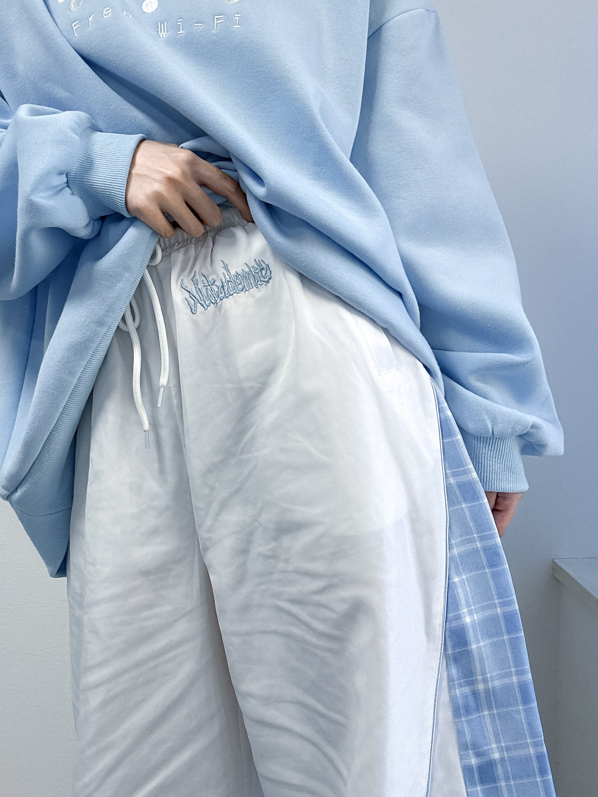 ウエストには紐、裾にはストッパーが付いていて、ウエストも丈感もそれぞれ調節もできるよ✨️